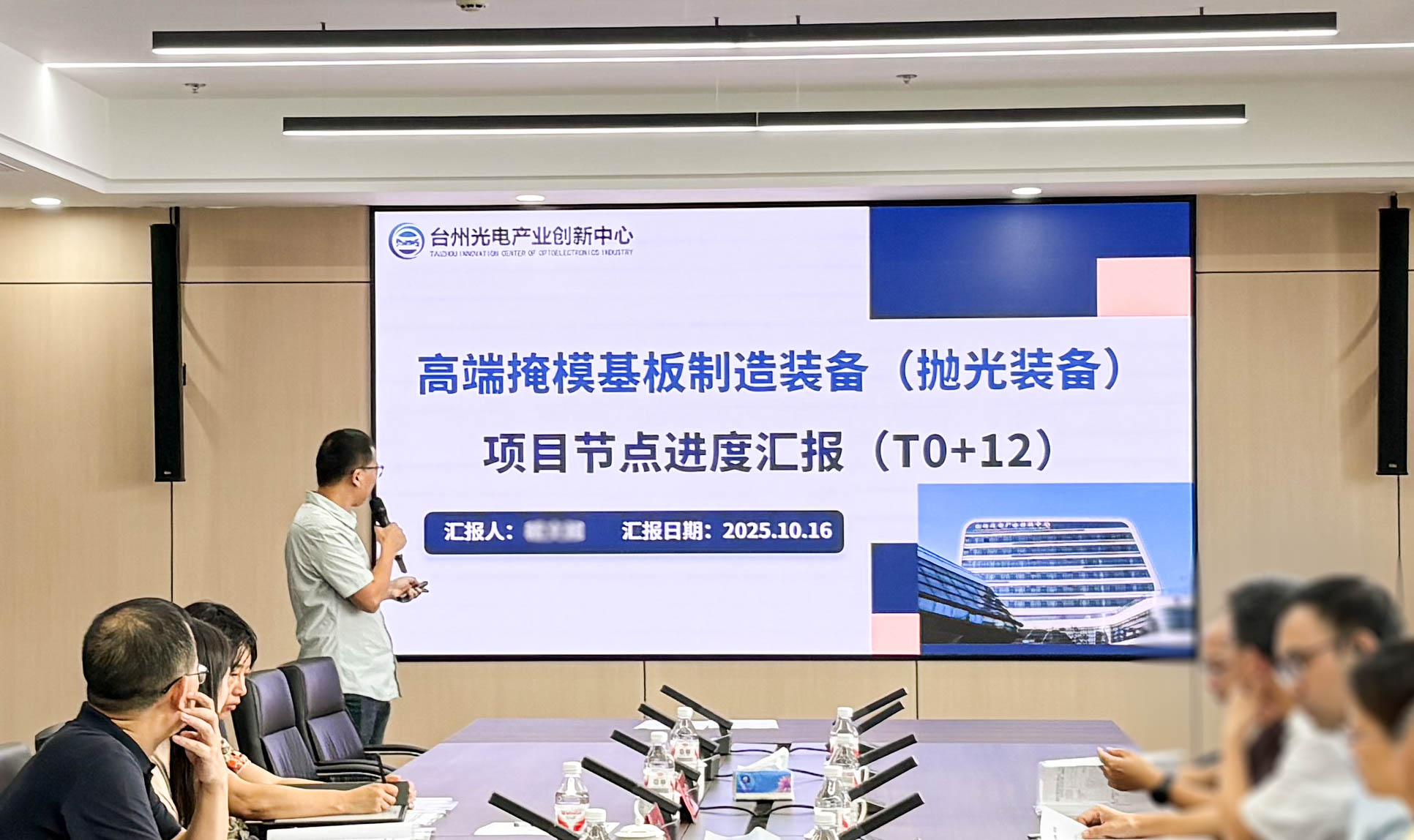 2025年10月16日,台州光电产业创新中心“高端掩模基板制造装备(抛光装备)项目”中期评审会顺利召开,来自高校、科研院所及知名企业的专家团队齐聚椒江,对项目阶段性成果进行全面检验。中心主任徐学科主持会议。