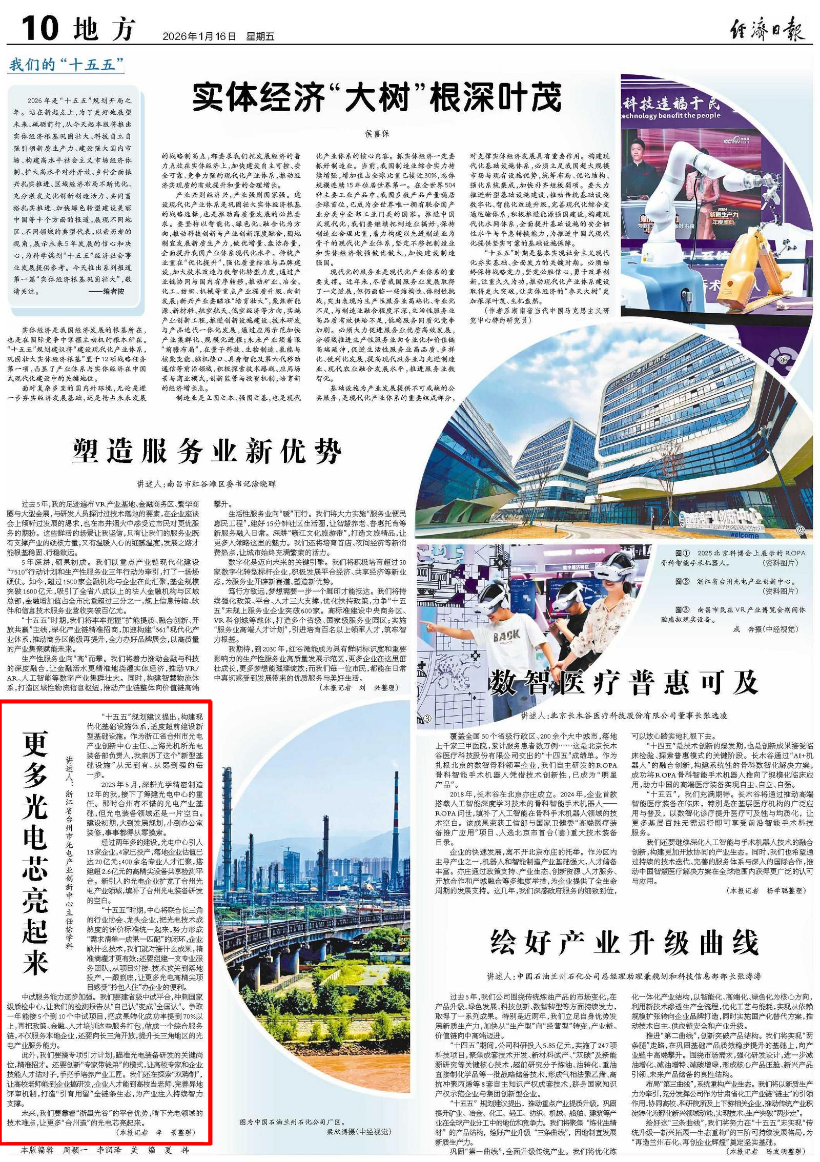 1月16日《经济日报》刊发《更多光电芯亮起来》,对话台州光电产业创新中心主任徐学科,解锁中心建设“进度条”与未来“路线图”。锚定“十五五”规划方向,以超前布局打造现代化产业基础设施,让更多台州“光电芯”闪耀市场!